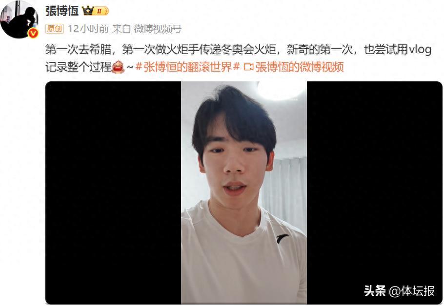 11月25日晚,中國體操運動員張博恆在社交媒體發佈視頻,視頻內容是自己出發前往希臘,擔任米蘭冬奧會火炬手的行前準備工作。他配文:“第一次去希臘,第一次做火炬手傳遞冬奧會火炬,新奇的第一次,也嘗試用vlog記錄整個過程。”
