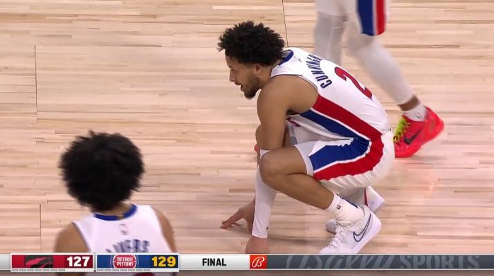 好在活塞的底線球成功發出,消耗掉最後一秒鐘。比賽結束那一刻,全場雷動,凱德·坎寧安蹲在地上,雙手撐着地板,沒有任何笑意。噩夢終於結束了,而他只是有些累了。球場內,杰倫·杜倫正在慶祝,觀衆們舉着“堅信” 的標語,有些人用手機打出了“連敗結束”的口號。