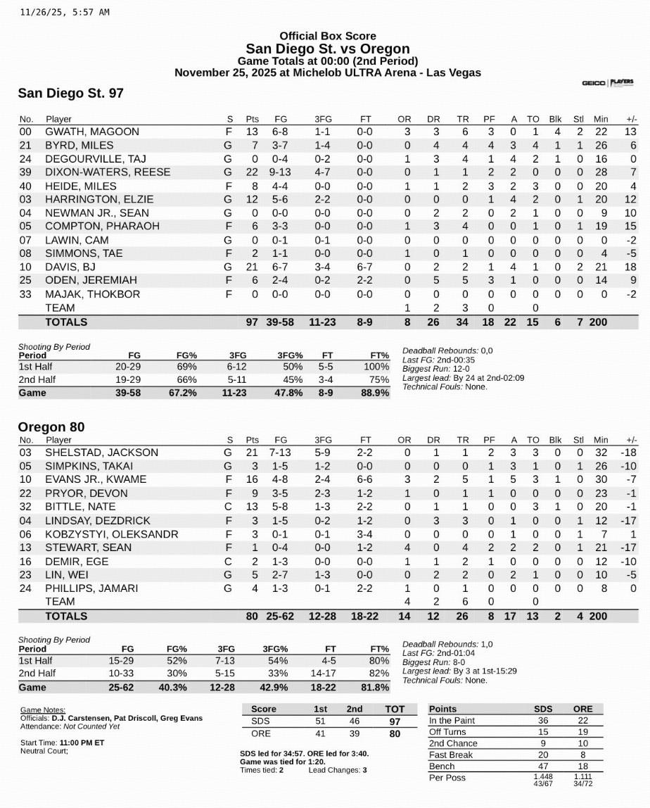 北京時間11月26日NCAA常規賽,俄勒岡80比97不敵聖地亞哥州立。
