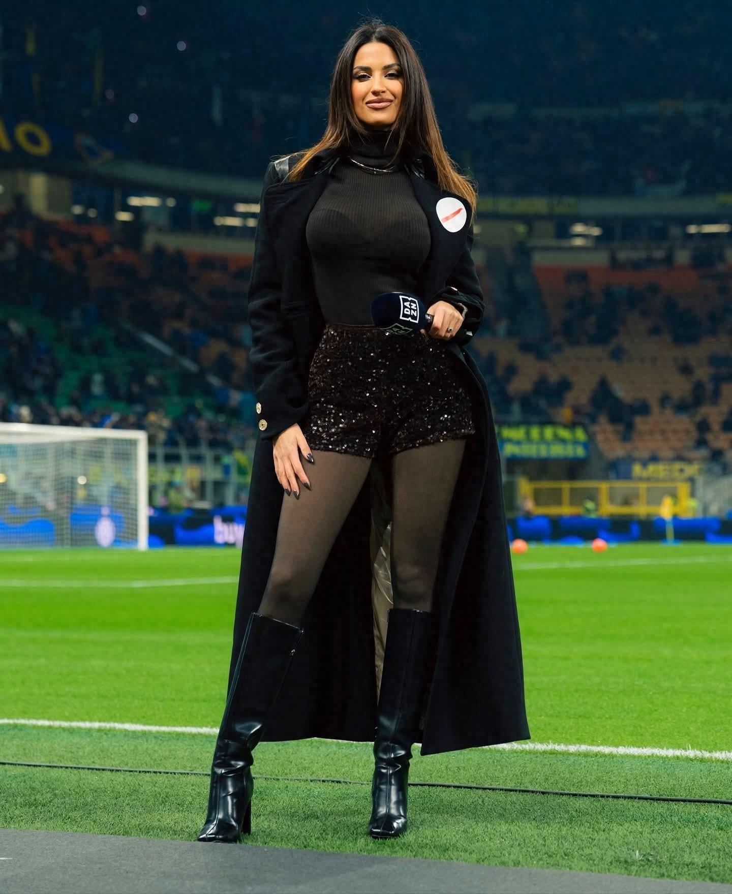 這位擁有130萬社媒粉絲的知名主持人身着黑色透視上裝與閃亮短褲,搭配黑絲襪及高跟靴,在聖西羅球場的轉播席引發廣泛關注。