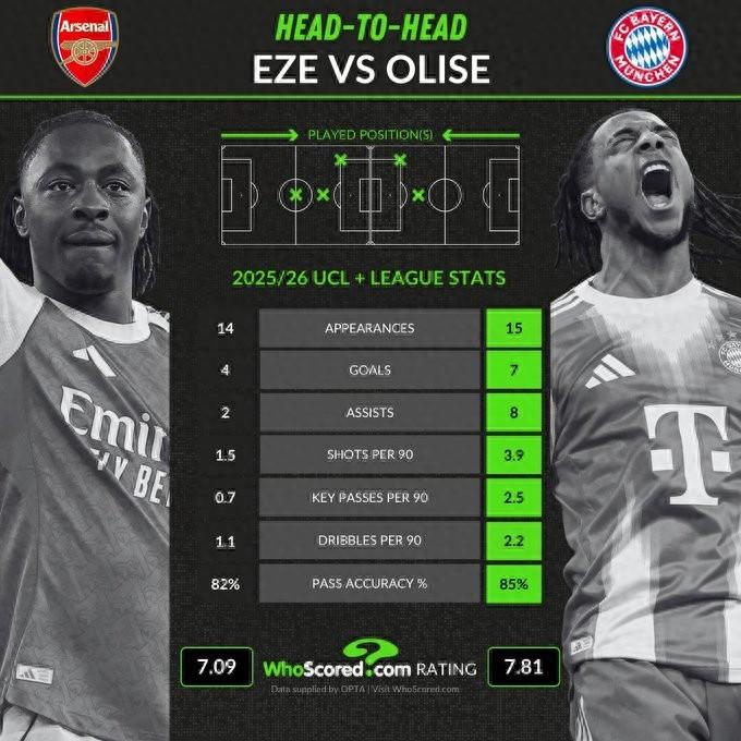 知名數據網站“WhoScored”對比昔日水晶宮雙星埃澤、奧利塞本賽季關鍵數據,後者均佔優。今日凌晨,阿森納將與拜仁在歐冠相遇,兩人將展開直接對話。