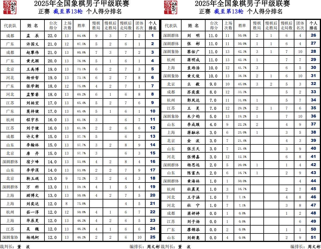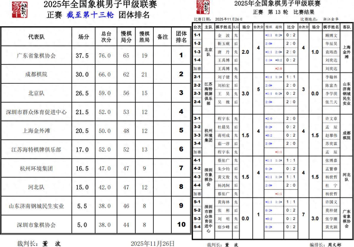 賽會十三輪過後,廣東37.5分,成都30分,北京26.5分,深圳21.5分,上海20.5分,江蘇17分,杭州16.5分,河北15分,山東5.5分,深協5分。