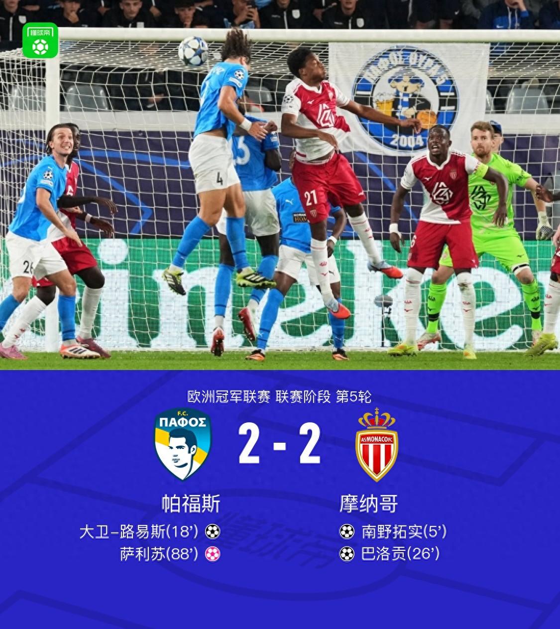 北京時間11月27日歐洲冠軍聯賽 聯賽階段 第5輪,帕福斯對陣摩納哥。帕福斯大衛-路易斯破門。摩納哥南野拓實破門,巴洛貢破門,薩利蘇自擺烏龍。最終比分帕福斯 2-2 摩納哥。