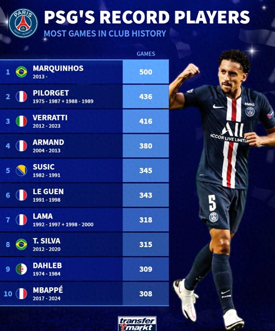 北京時間11月27日,巴黎聖日耳曼的隊長馬爾基尼奧斯在歐冠聯賽階段第5輪他們主場與托特納姆熱刺的比賽中迎來了自己代表俱樂部出戰500場正式比賽的里程碑,與此同時德轉則列出了PSG隊史出場次數排名前10的球員,馬爾基尼奧斯高居第1,姆巴佩第10,維拉蒂和蒂亞戈-席爾瓦上榜。