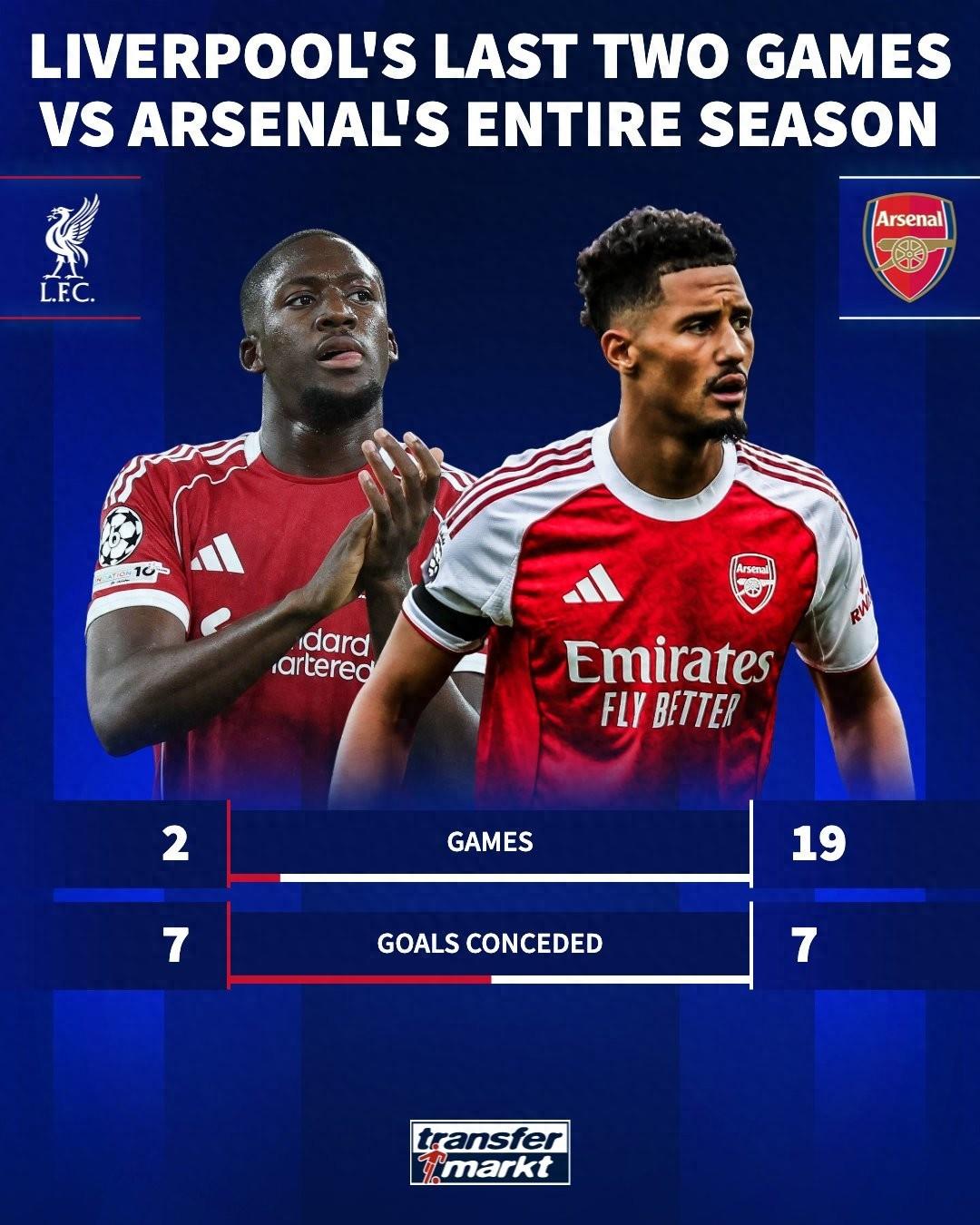 根據德國轉會市場的統計數據,最近兩場比賽,利物浦一共丟了7球(1-4不敵埃因霍溫、0-3諾丁漢森林),而這兩場比賽的丟球數和阿森納本賽季19場比賽的丟球數一樣多。