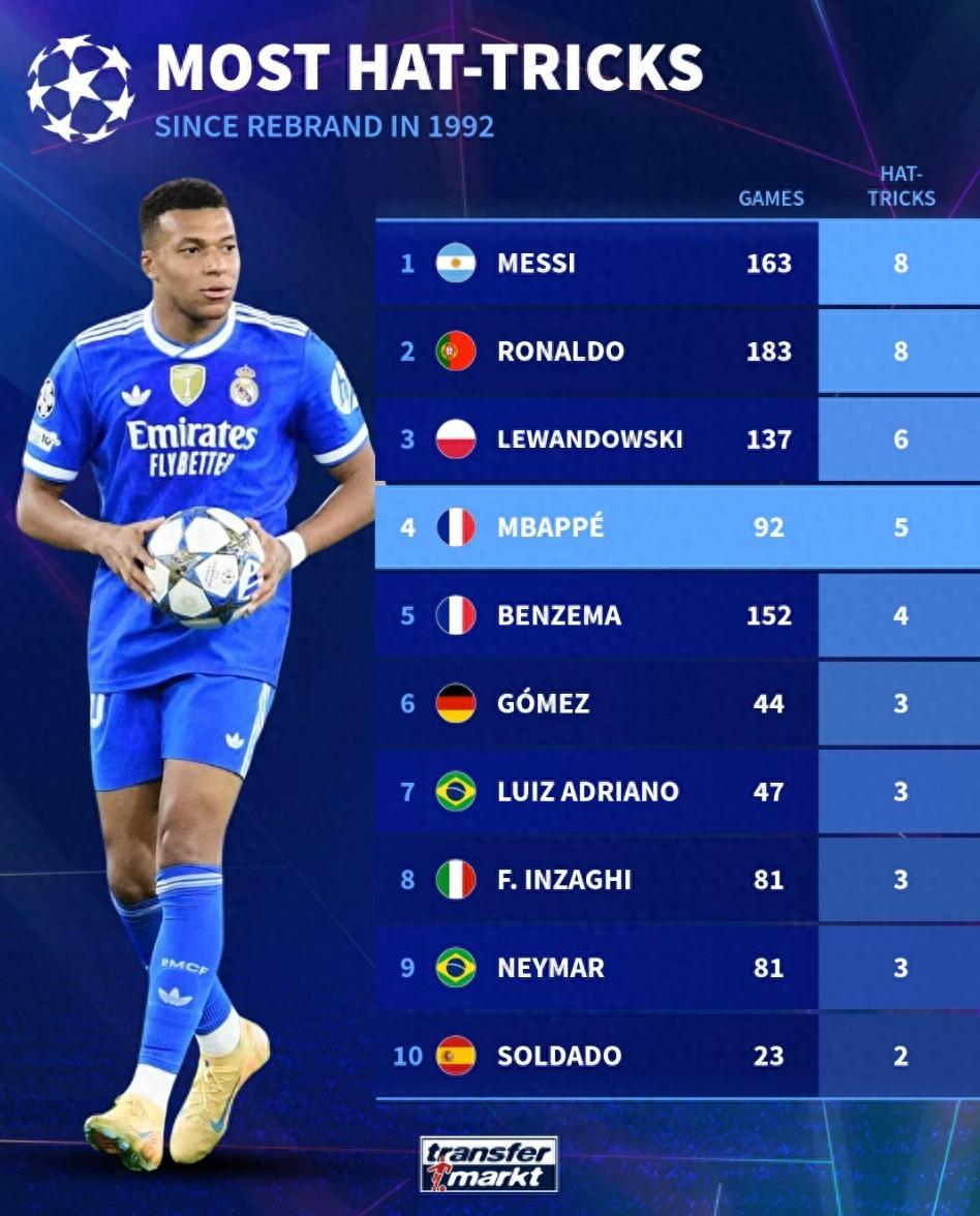 北京時間11月27日,在姆巴佩用一次大四喜幫助皇家馬德里客場4-3戰勝奧林匹亞科斯,贏得歐冠聯賽階段第5輪比賽的勝利之後,德轉統計出了歐冠自1992年改制以來戴帽次數最多的球員,梅西和C羅同以8次並列第一,姆巴佩5次排名第四。