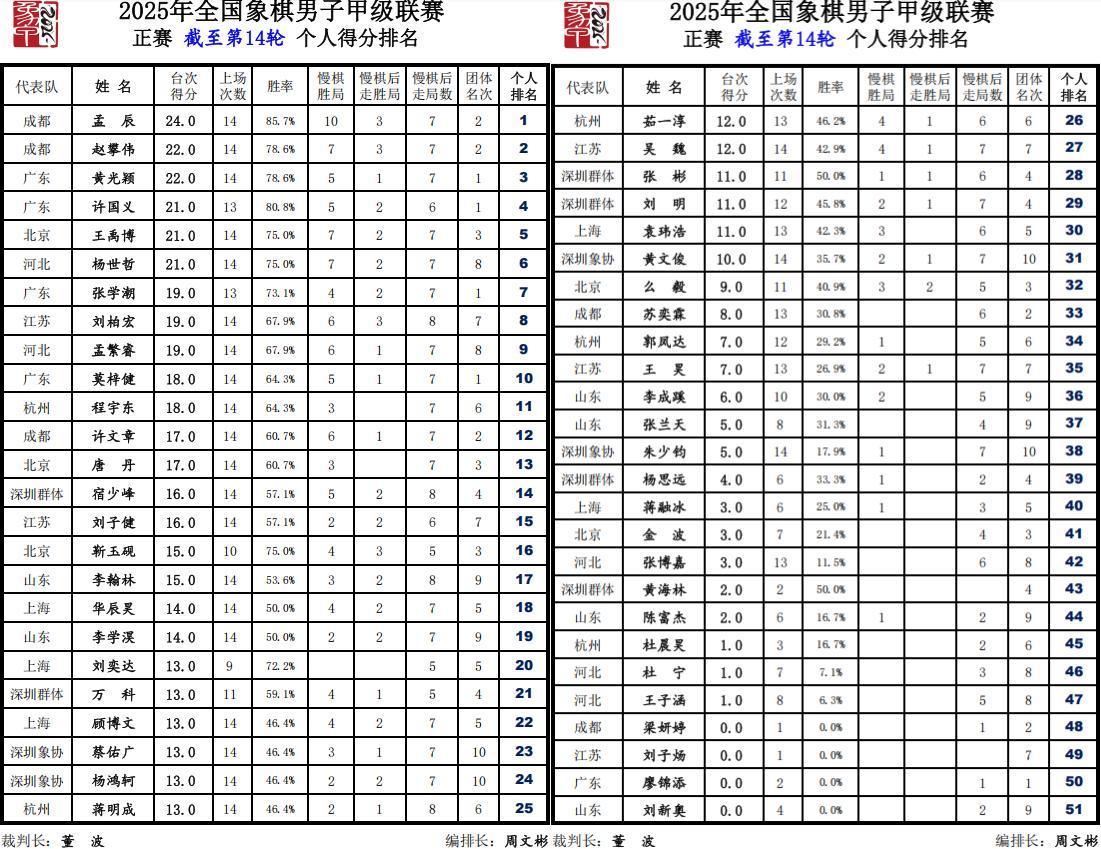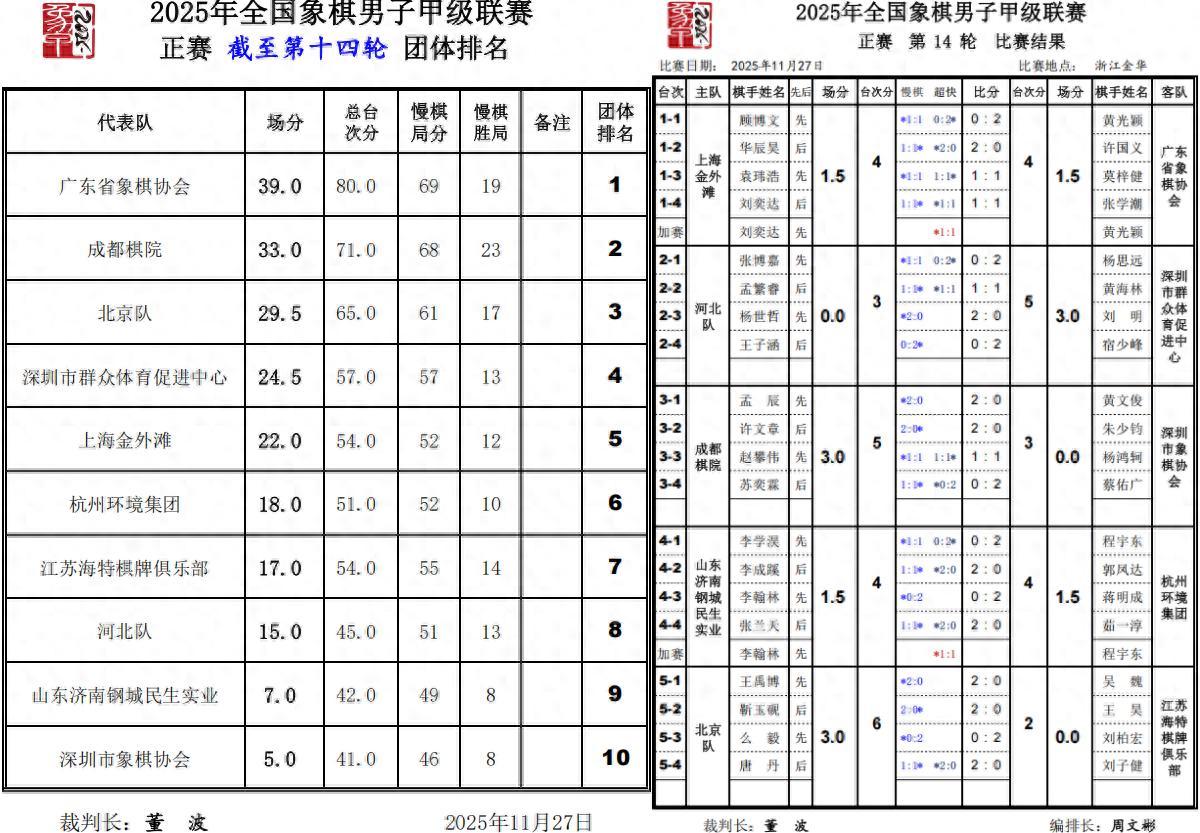 比賽十四戰過後,廣東39分,成都33分,北京29.5分,深圳24.5分,上海22分,杭州18分,江蘇17分,河北15分,山東7分,深圳5分。