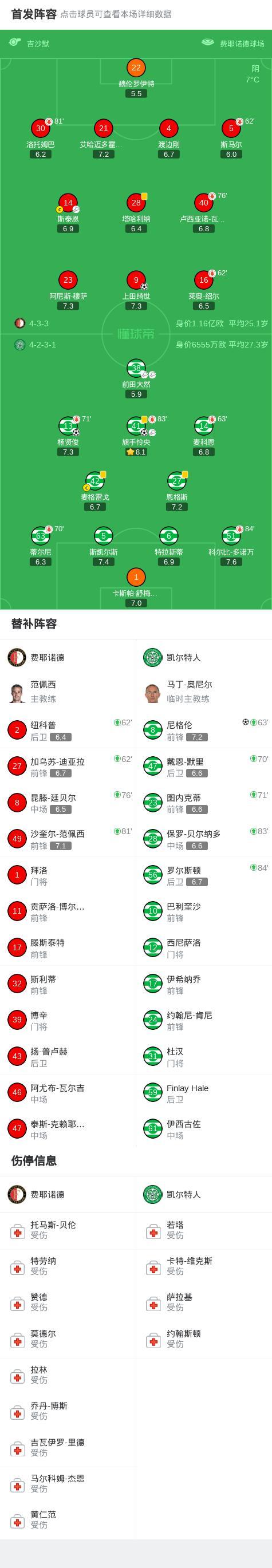 北京時間11月28日歐足聯歐洲聯賽 聯賽階段 第5輪,費耶諾德對陣凱爾特人。費耶諾德上田綺世破門。凱爾特人楊賢俊破門,旗手憐央破門,尼格倫破門。最終比分費耶諾德 1-3 凱爾特人。