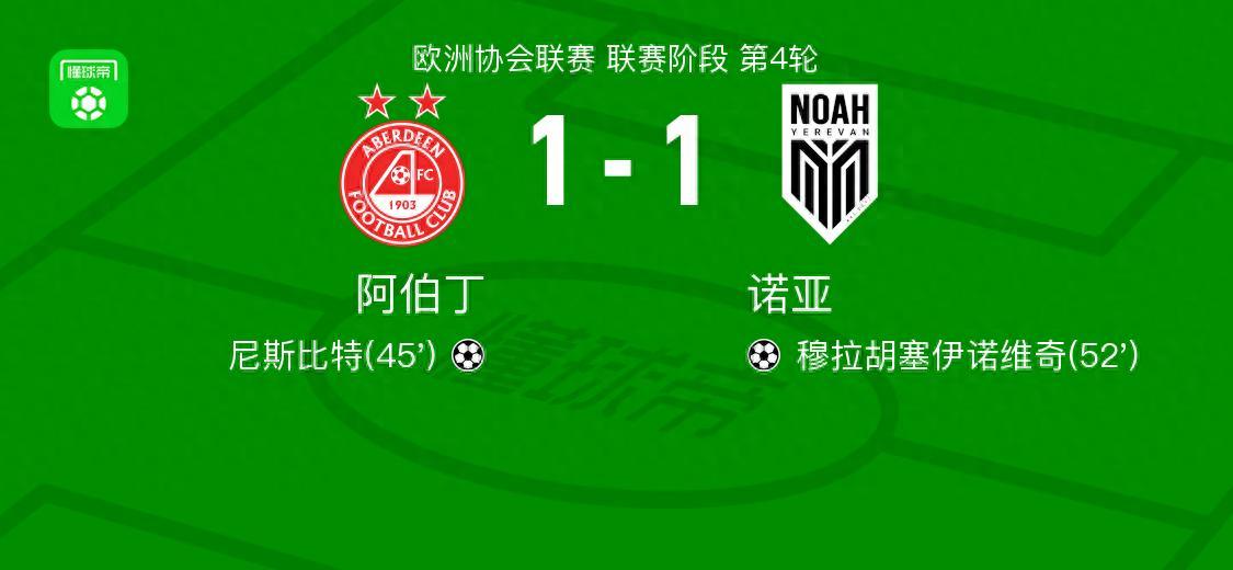 北京時間11月28日,歐洲協會聯賽聯賽階段第4輪,阿伯丁與諾亞展開較量。比賽中,凱斯基寧送出助攻,尼斯比特破門得分,爲球隊取得領先。隨後,馬特烏斯-艾阿斯完成助攻,穆拉胡塞伊諾維奇將球打進,幫助諾亞扳平比分。全場比賽結束,雙方以1比1握手言和。