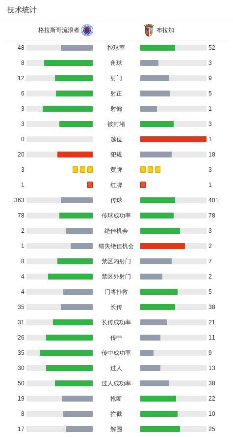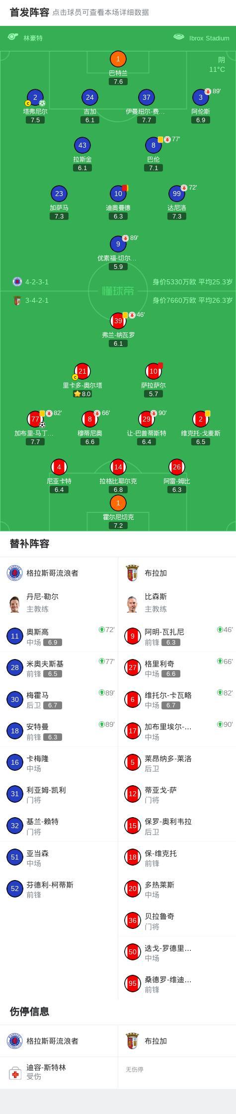 北京時間11月28日,歐足聯歐洲聯賽聯賽階段第5輪,格拉斯哥流浪者與布拉加上演激烈對決。上半場補時階段,塔弗尼爾主罰點球命中,幫助球隊取得領先。進入下半場,布拉加球員薩拉薩爾被紅牌罰下。隨後,加布裏-馬丁內斯抓住機會扳平比分。比賽尾聲階段,迪奧曼德累計兩張黃牌被罰出場。最終雙方以1比1握手言和。