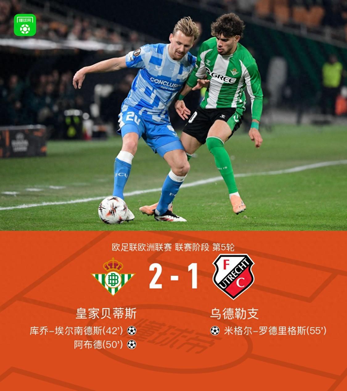 北京時間11月28日,歐足聯歐洲聯賽聯賽階段第5輪展開較量,皇家貝蒂斯與烏德勒支狹路相逢。比賽中,皇家貝蒂斯率先打破僵局,安東尼送出助攻,庫喬-埃爾南德斯完成破門。易邊再戰,福爾納爾斯成功策動進攻,阿布德接應得分,幫助球隊擴大領先優勢。隨後烏德勒支展開反擊,阿萊助攻米格爾-羅德里格斯破門,爲球隊扳回一城。此後雙方均未能改寫比分,最終全場結束,皇家貝蒂斯以2比1戰勝烏德勒支。