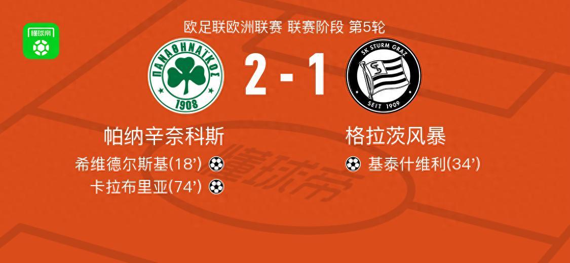 北京時間11月28日,歐足聯歐洲聯賽聯賽階段第5輪,帕納辛奈科斯迎戰格拉茨風暴。比賽開局階段,扎魯裏送出助攻,希維德爾斯基破門得分,爲帕納辛奈科斯取得領先。隨後,斯坦科維奇爲基泰什維利創造機會,後者破門扳平比分。進入下半場,巴卡西塔斯送出關鍵助攻,卡拉布里亞攻入制勝進球。最終,帕納辛奈科斯以2比1戰勝格拉茨風暴。