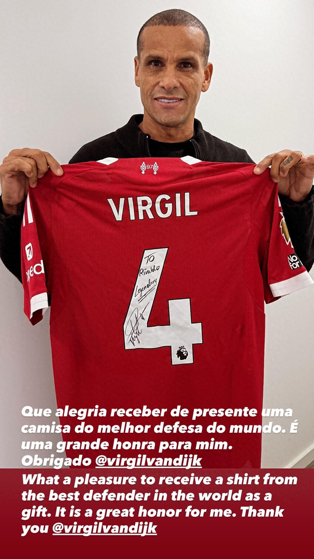 北京時間11月28日,巴西足球名宿裏瓦爾多在社交媒體上分享了自己收到的範戴克球衣。