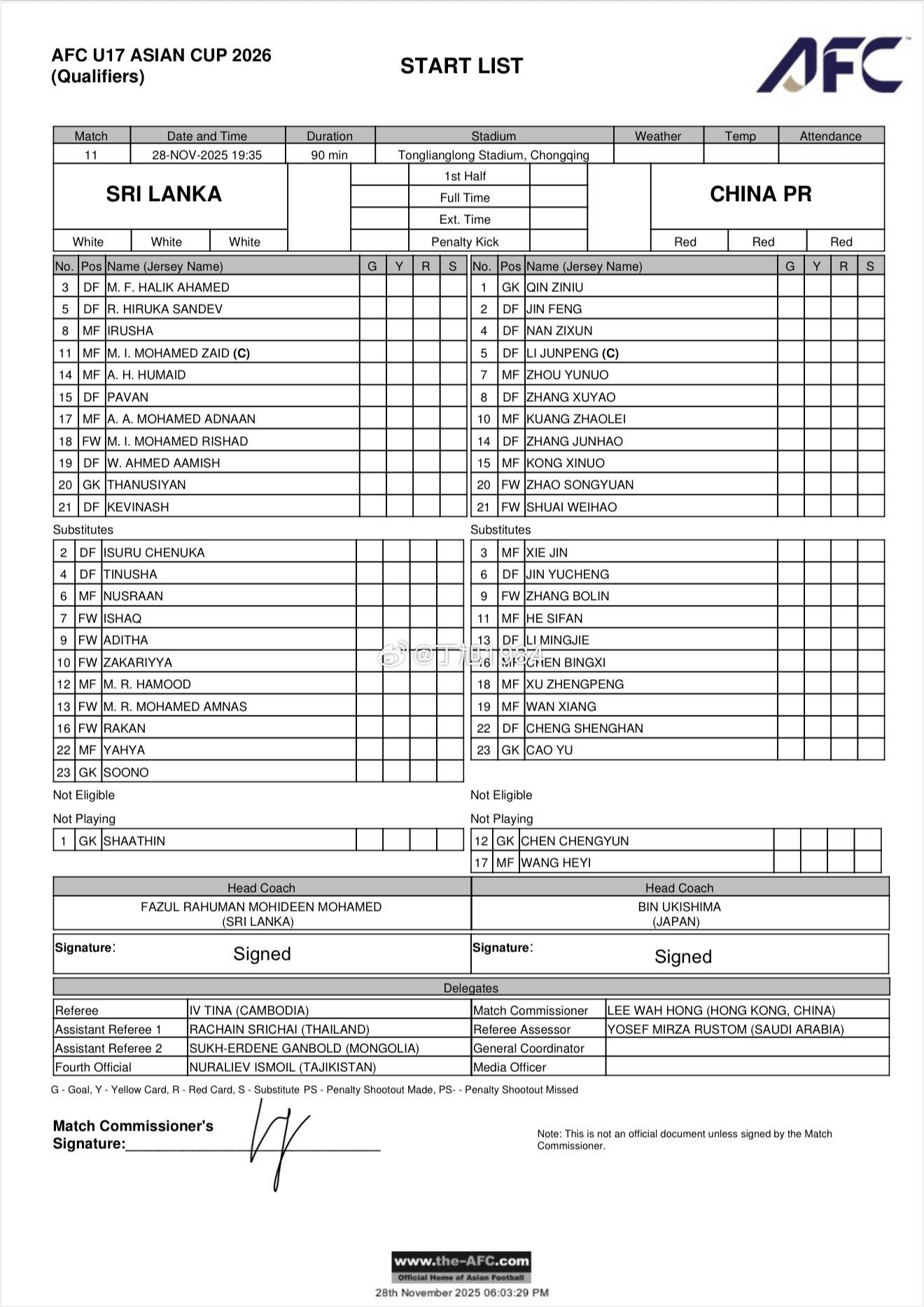 北京時間11月28日19:35,U17亞洲盃預選賽第四輪,中國U17對陣斯里蘭卡U17,賽前雙方公佈首發: