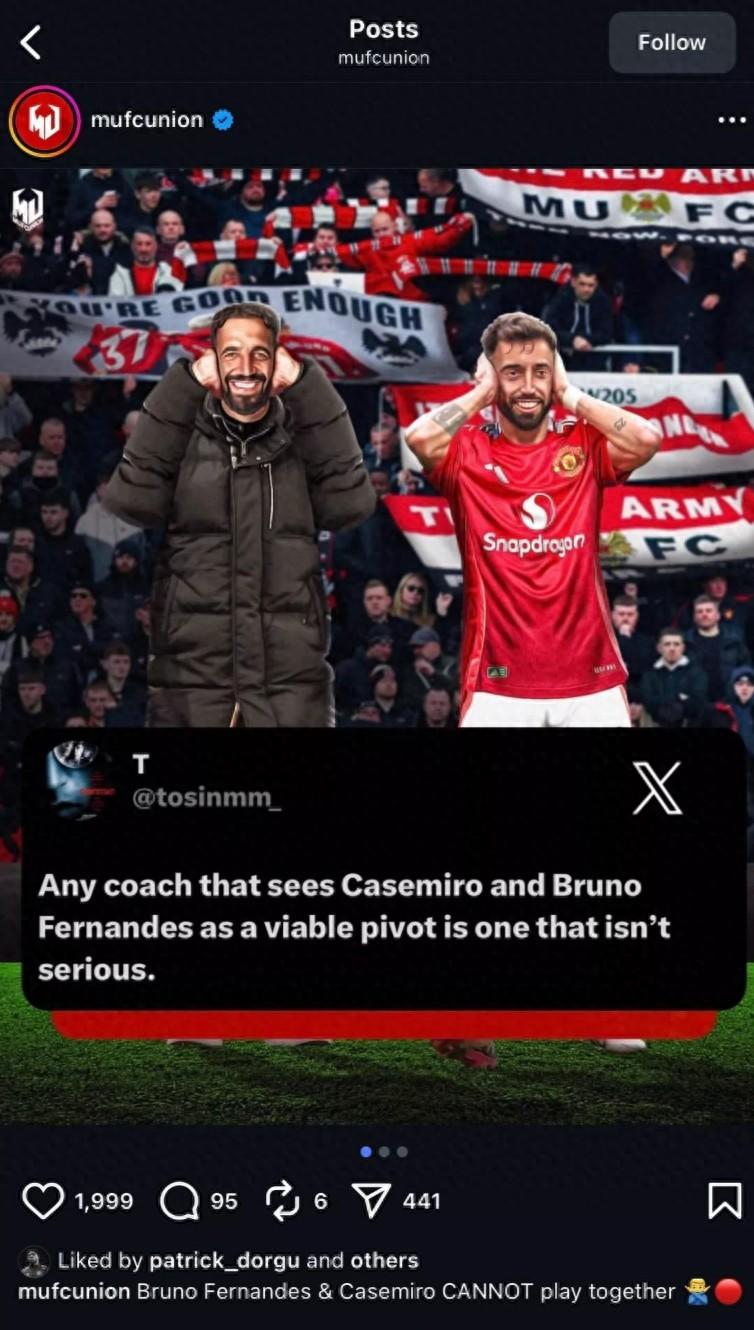 這篇帖子的配文宣稱:“布魯諾-費爾南德斯和卡塞米羅無法一起出場”,並得到了多古的點贊。這位邊翼衛今年早些時候以2500萬英鎊從萊切轉會加盟曼聯,本賽季在各條戰線上出場12次,貢獻1次助攻。