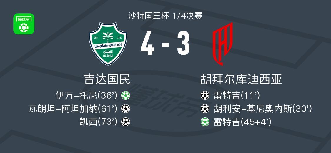 北京時間11月29日沙特國王杯 1/4決賽,吉達國民對陣胡拜爾庫迪西亞。吉達國民伊萬-託尼破門,瓦朗坦-阿坦加納破門,凱西破門。胡拜爾庫迪西亞雷特吉梅開二度,胡利安-基尼奧內斯破門。最終比分吉達國民 4-3 胡拜爾庫迪西亞。