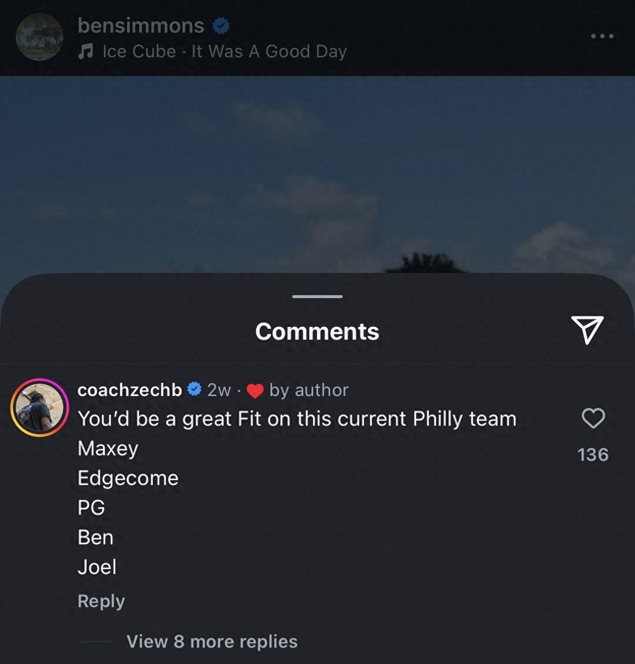 破鏡重圓?本-西蒙斯點贊網友讓其迴歸76人的評論