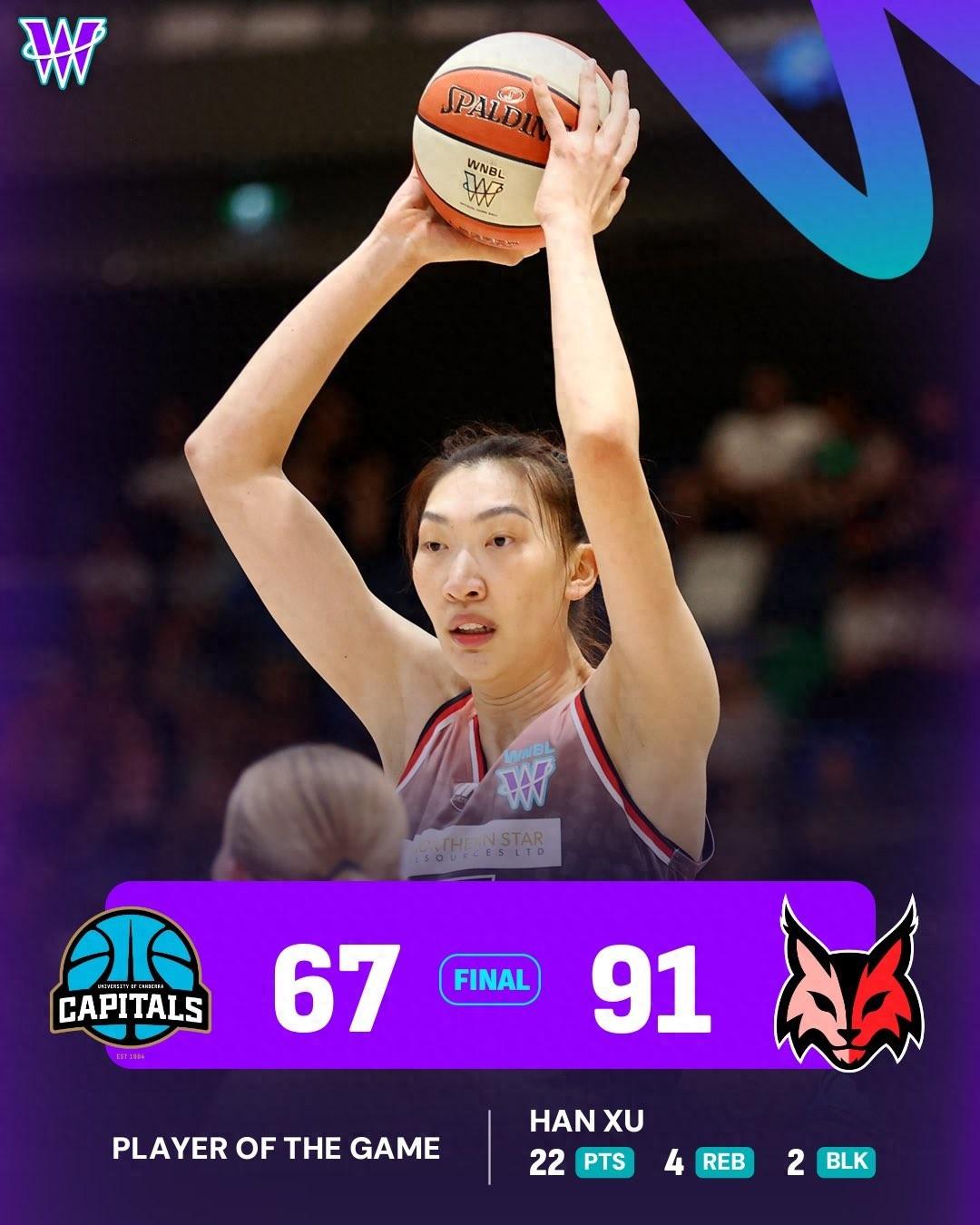韓旭WNBL首秀砍下22分4板2帽,兩分球9中9