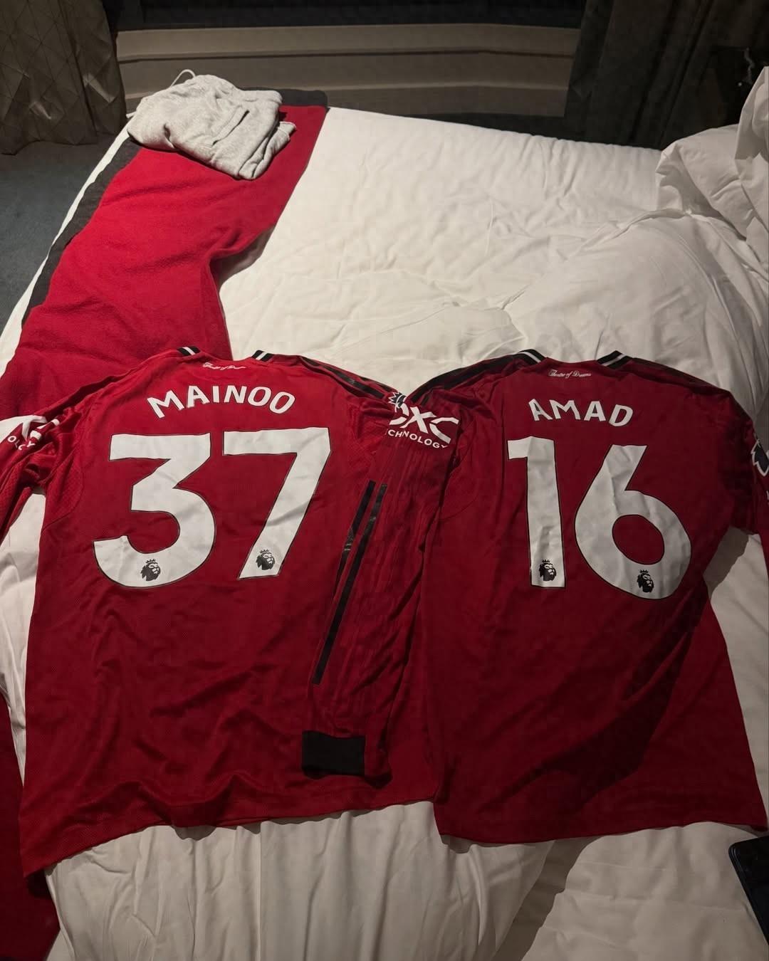 今年9月,英超聯賽第5輪,曼聯在主場2-1戰勝了切爾西。阿馬德-迪亞洛首發出戰並打滿了全場,梅努則是在比賽尾聲階段獲得了登場機會,今夏轉會至切爾西的加納喬則是枯坐板凳席、未獲登場時間,不知道加納喬拍攝的這兩件球衣是否是這場比賽梅努和阿馬德身穿的球衣。
