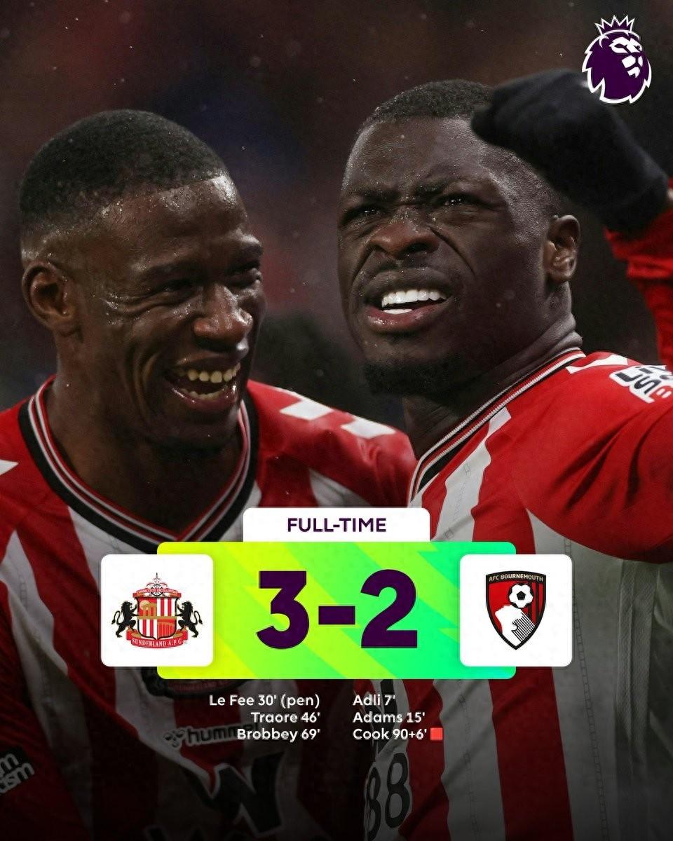 英超第13輪,桑德蘭主場3-2逆轉擊敗伯恩茅斯,這是桑德蘭隊史首次在英超落後2+球的情況下逆轉取勝。