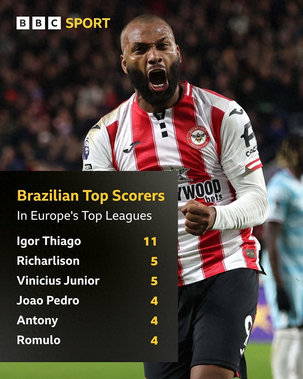 北京時間11月30日,英國媒體節目《Match of the Day》統計出了本賽季至今歐洲五大聯賽巴西球員射手榜,本輪英超完成梅開二度幫助布倫特福德主場3-1擊敗伯恩利的伊戈爾-蒂亞戈以11球斷檔領先,維尼修斯和安東尼上榜。