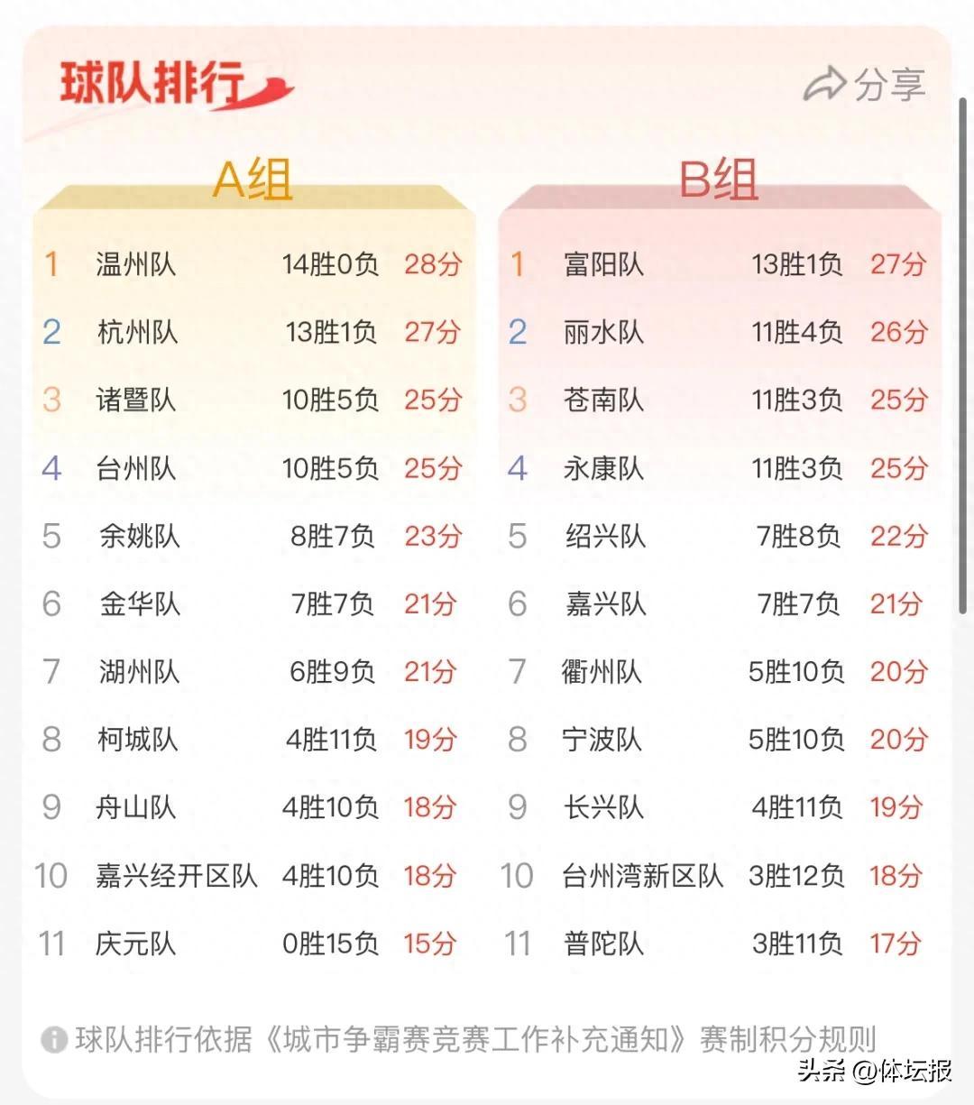 本場比賽後,杭州隊的戰績爲13勝1負積27分,慶元隊的戰績爲0勝15負積15分。
