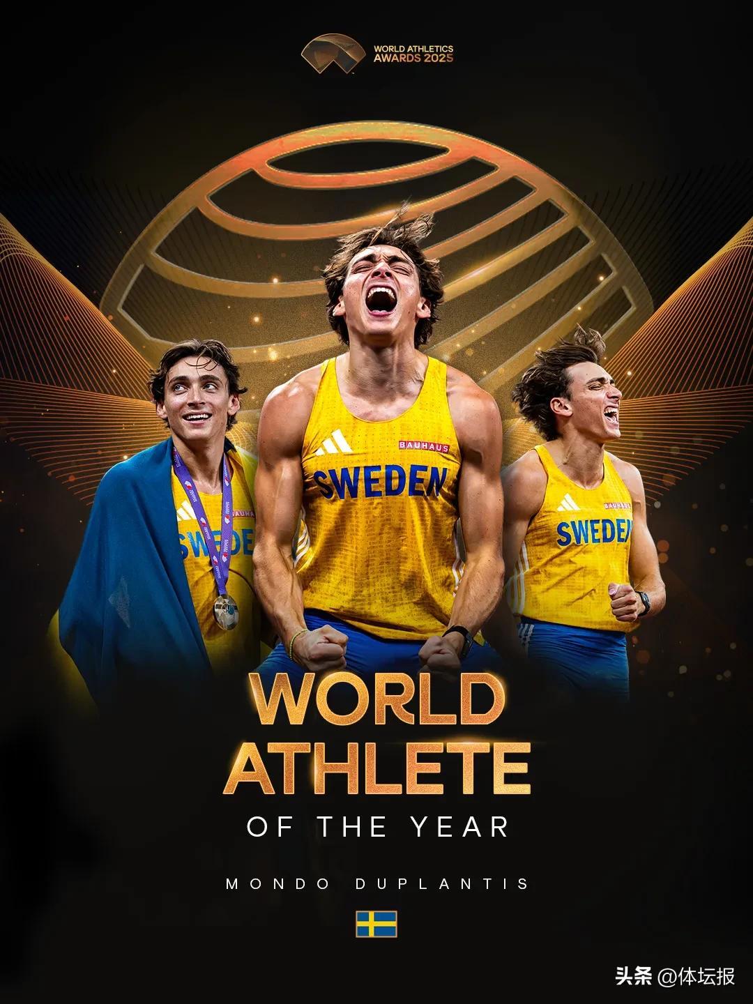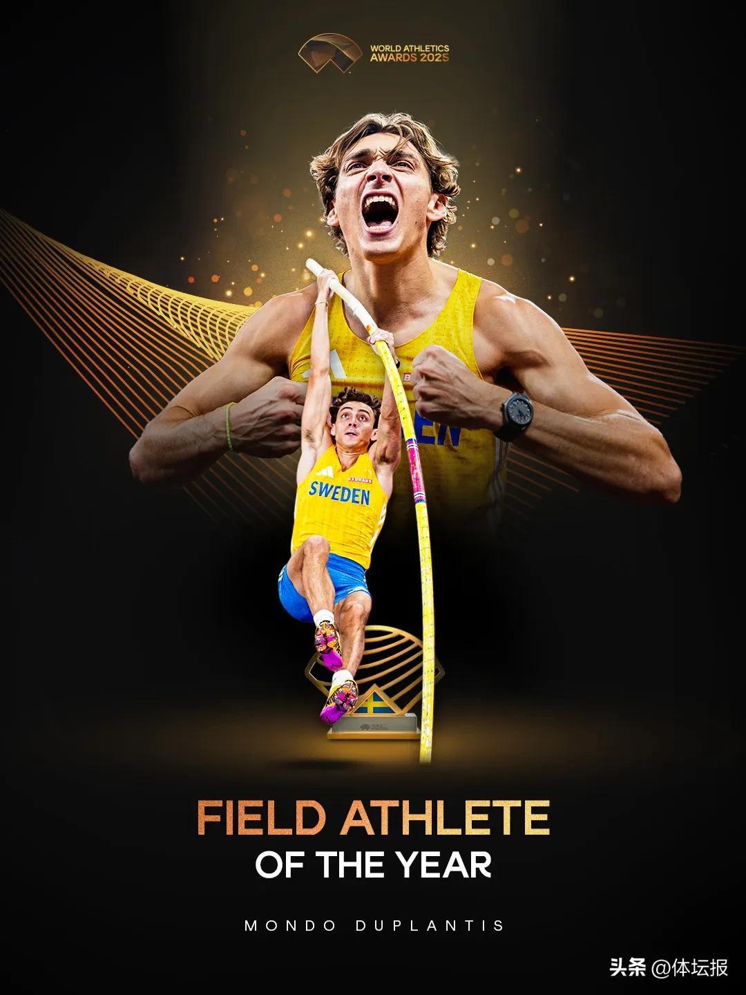 據世界田聯官微介紹,這一年裏,杜普蘭蒂斯16戰全勝,獲得2025南京世界田聯室內錦標賽和2025年東京田徑世錦賽冠軍,4次打破世界紀錄,將撐竿跳高帶進了6米30時代——他也是史上第一位連續兩個賽季保持不敗的男子撐竿跳高選手。這也是杜普蘭蒂斯職業生涯第四次獲得世界田聯年度最佳男運動員,此前他曾在2020、2022和2023年獲獎。