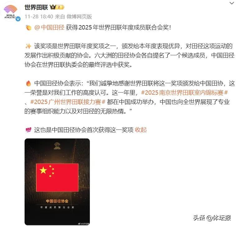 另外,此前國際田聯宣佈,中國田徑獲得2025年世界田聯年度成員聯合會獎。該獎項也是世界田聯年度獎項之一,頒發給本年度表現優異,對田徑這項運動的發展作出積極貢獻的協會。這也是中國田徑協會首次獲得這一獎項。