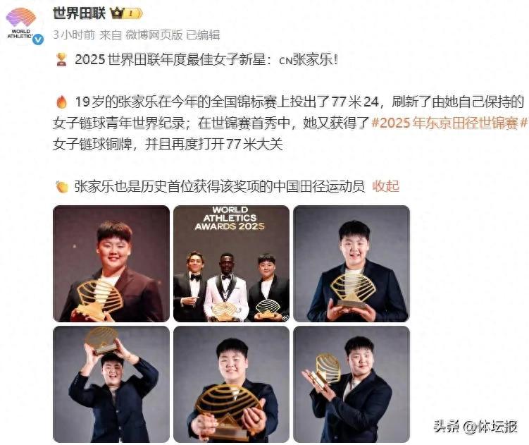 當地時間11月30日,2025年度世界田聯頒獎典禮在摩納哥舉行,各年度獎項獲獎者揭曉。其中,中國女子鏈球運動員張家樂榮獲“2025年世界田聯年度最佳女子新星”,成爲史上首位獲得該獎項的中國田徑運動員。