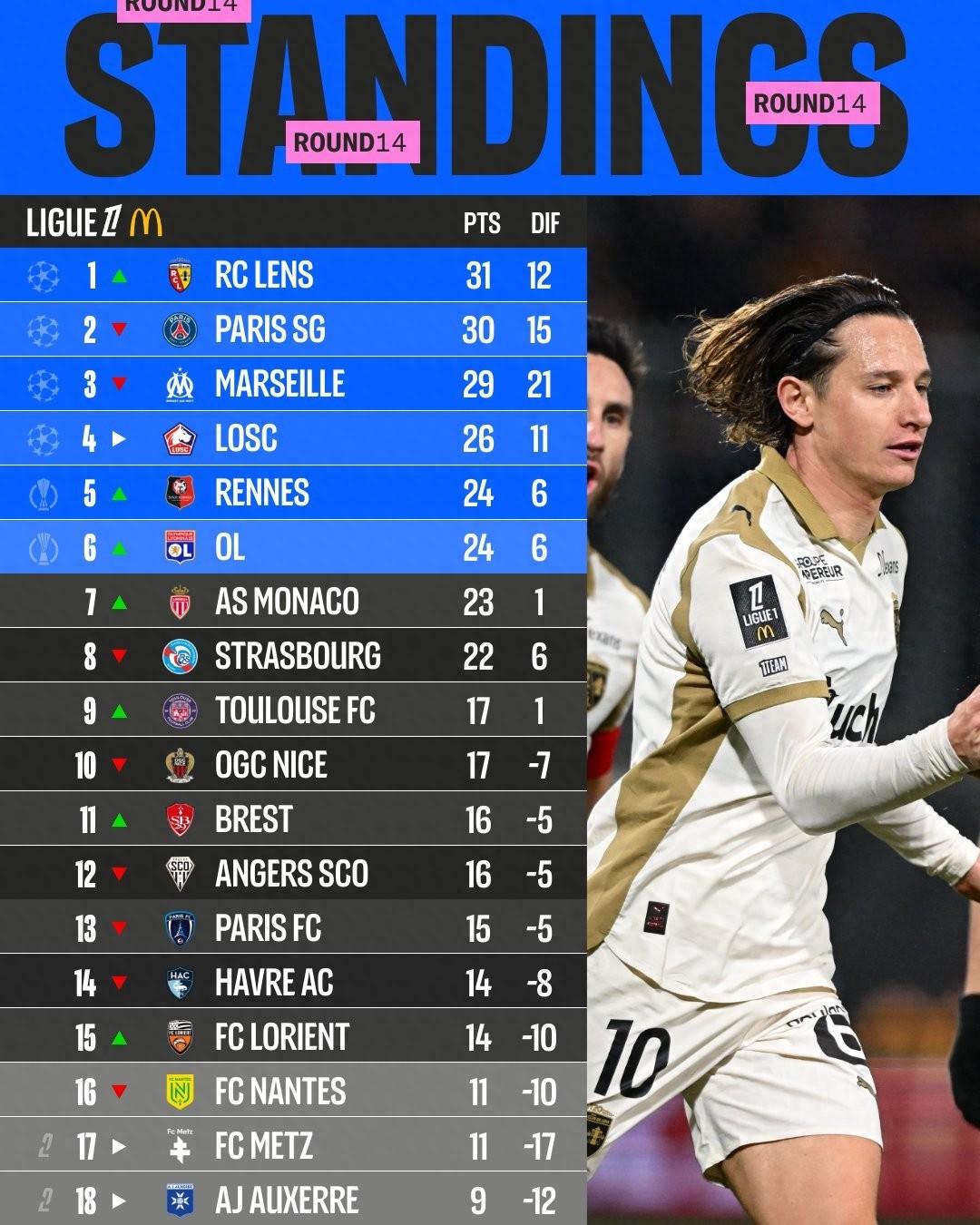 本賽季,朗斯14輪過後10勝1平3負積31分排名第1,巴黎聖日耳曼則14輪9勝3平2負積30分。