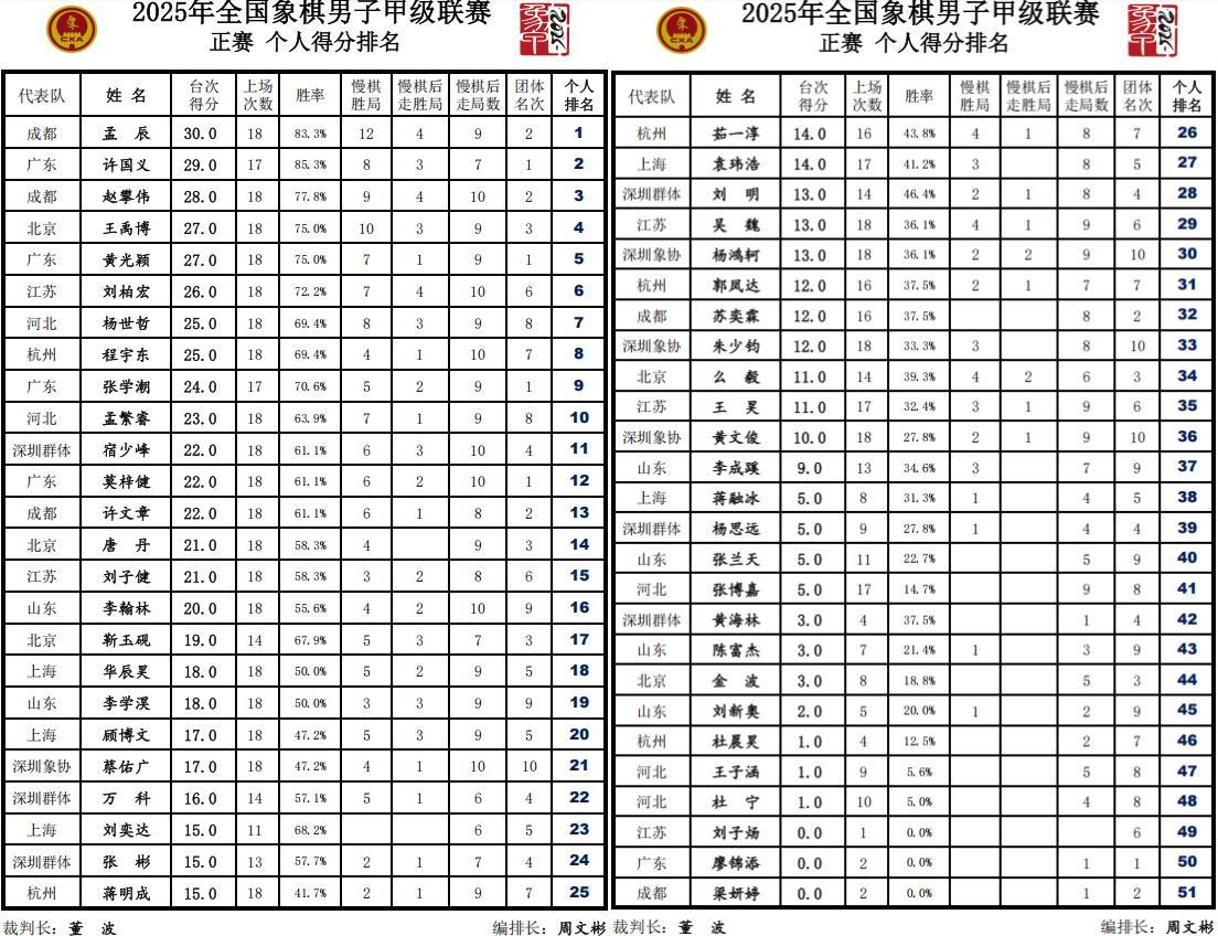 個人得分孟辰30,許國義29,趙攀偉28,王禹博、黃光穎27,劉柏宏26,楊世哲、程宇東25,張學潮24,孟繁睿23,宿少峯、莫梓健、許文章22。