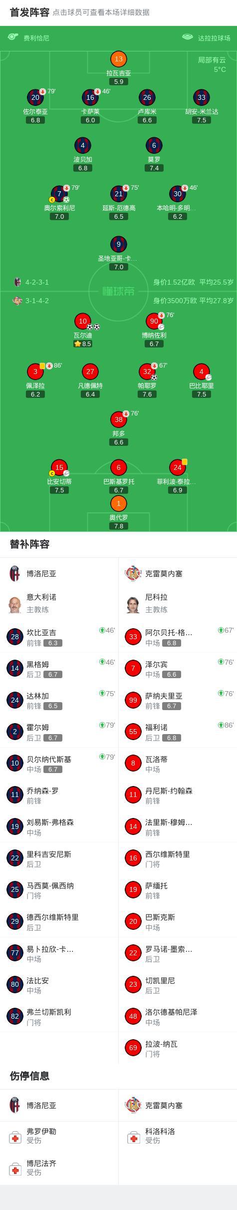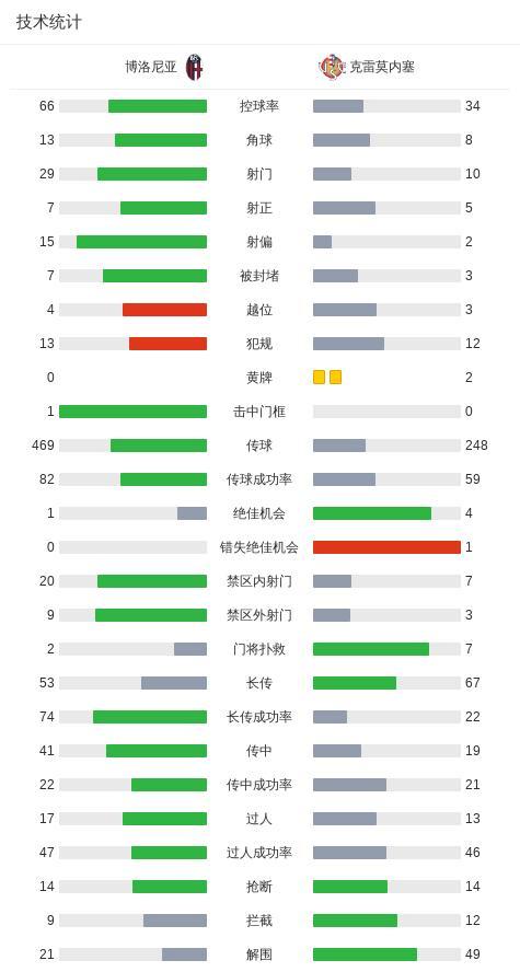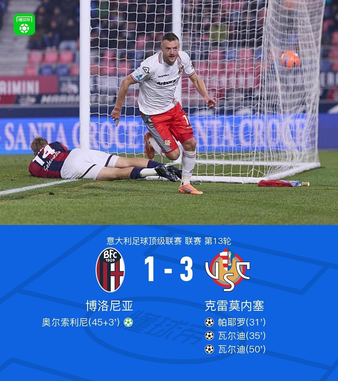 北京時間12月2日意大利足球頂級聯賽 聯賽 第13輪,博洛尼亞主場對陣克雷莫內塞。博洛尼亞奧爾索利尼破門。克雷莫內塞帕耶羅破門,瓦爾迪梅開二度。最終比分博洛尼亞 1-3 克雷莫內塞。