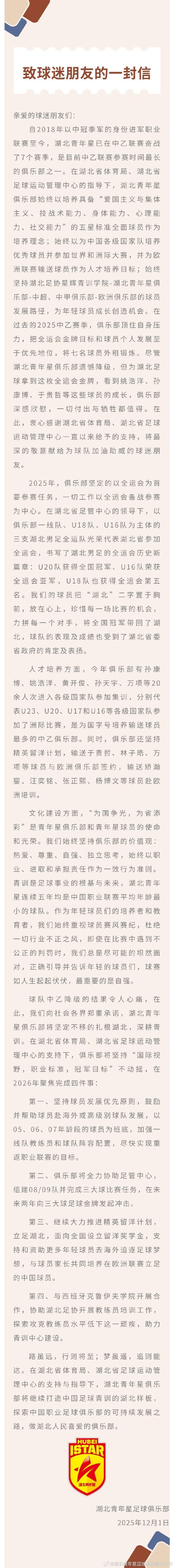 本賽季降級到中冠的湖北青年星發佈致球迷朋友的一封信,表態儘快重返職業聯賽;大力推進留洋計劃。