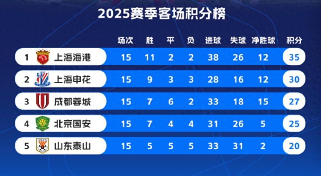 北京時間12月2日,中超官方統計出了2025賽季客場積分排名前五的球隊,最終奪冠的上海海港以11勝2平2負積35分的客場成績高居第一,上海申花5分之差排名第二。