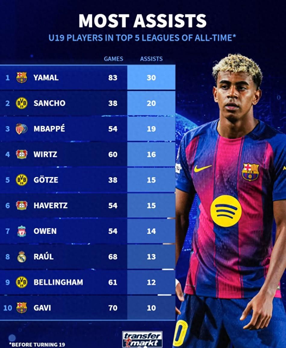 五大聯賽歷史U19助攻榜:亞馬爾、桑喬、姆巴佩前三