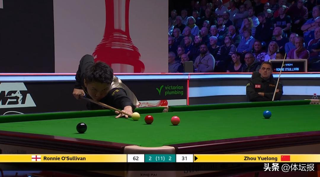 全場周躍龍打出單杆125分破百,羅尼·奧沙利文打出單杆71、123、62、94分。周躍龍在2-0領先的情況下,遭遇奧沙利文單杆71、123分追平,進入中場休息。