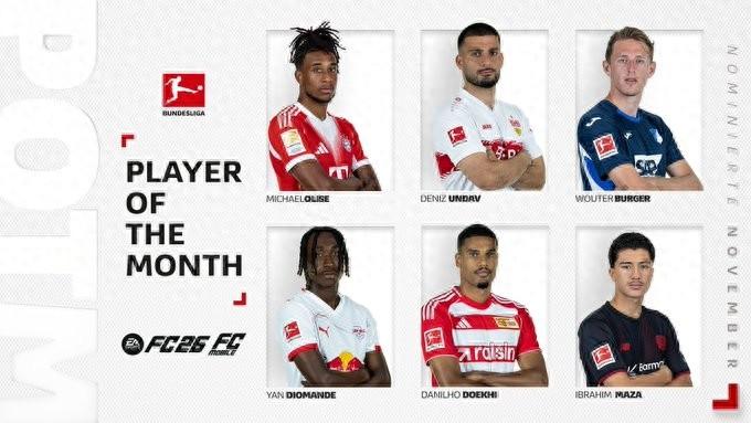 北京時間12月3日,德甲11月最佳球員候選名單公佈,這6名球員爲奧利塞、昂達夫、布格爾、揚-迪奧曼德、多克希、馬紮。