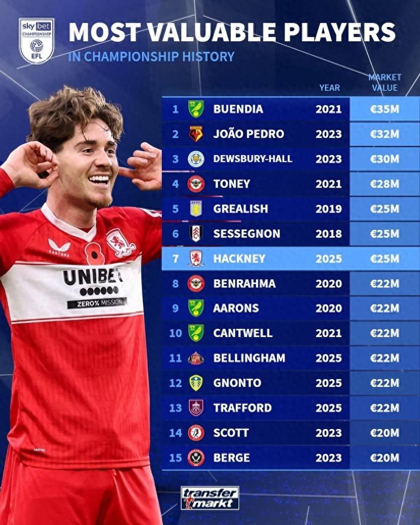北京時間12月3日,在更新了英冠球員的身價之後,德轉還列出了英冠歷史身價最高的15名球員,2021年效力於諾維奇的布恩迪亞以3500萬歐元排名第一,2023年效力於沃特福德的若昂-佩德羅3200萬歐元排名第二,此外迪尤斯伯裏-霍爾、伊萬-託尼、格拉利什、喬布-貝林厄姆、尼奧托以及特拉福德也都榜上有名。