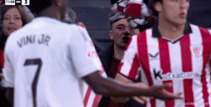 第74分鐘,慢鏡頭給到維尼修斯伸出三個手指回應對方球迷