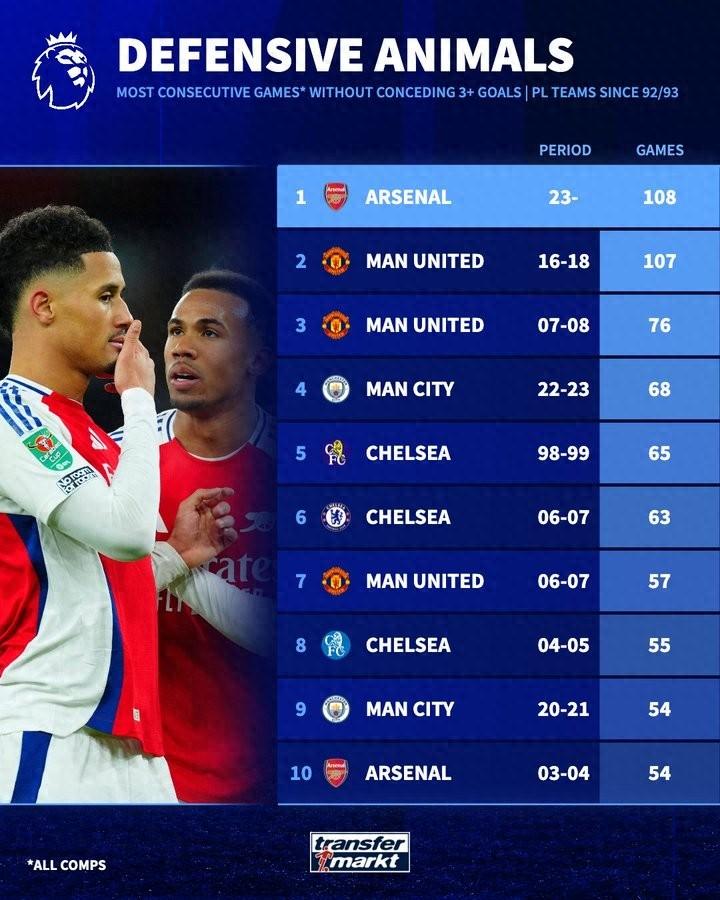 根據統計,阿森納已經在連續108場比賽中單場比賽中丟球不超過3球,創造了英超球隊在所有賽事中單場比賽失球不超過3個的紀錄。