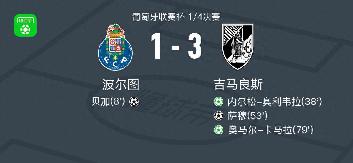 北京時間12月5日,葡萄牙聯賽盃1/4決賽展開較量,波爾圖迎戰吉馬良斯。比賽開局階段,羅薩里奧送出助攻,貝加冷靜破門,爲波爾圖取得領先。隨後,吉馬良斯由內爾松-奧利韋拉通過點球成功扳平比分。進入下半場,薩穆抓住機會攻入一球,幫助吉馬良斯實現反超。比賽後段,奧馬爾-卡馬拉主罰點球命中,進一步擴大領先優勢。最終,吉馬良斯以3比1逆轉戰勝波爾圖,晉級下一輪。