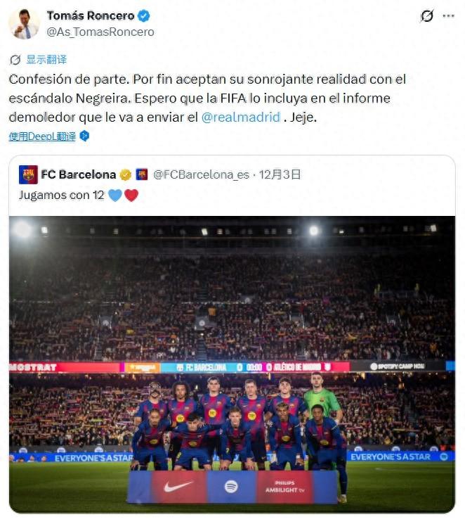 早些時候,龍賽羅轉發了該貼文,並寫道:“當事人已認罪,最終承認了與內格雷拉醜聞相關的難堪事實。希望國際足聯能把這一點放進即將發給皇家馬德里的那份震撼報告裏,呵呵。”
