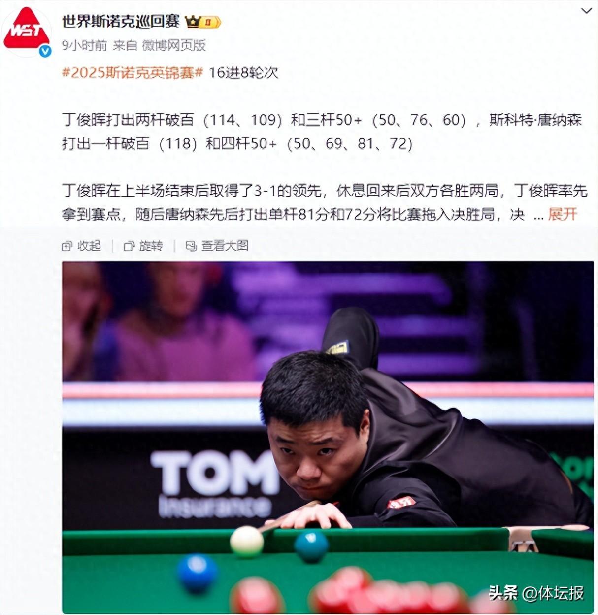北京時間12月5日凌晨,丁俊暉在斯諾克英國錦標賽16強賽中,以6:5險勝蘇格蘭選手斯科特·唐納森,晉級八強。世錦賽衛冕冠軍趙心童以2:6不敵張安達,無緣晉級。