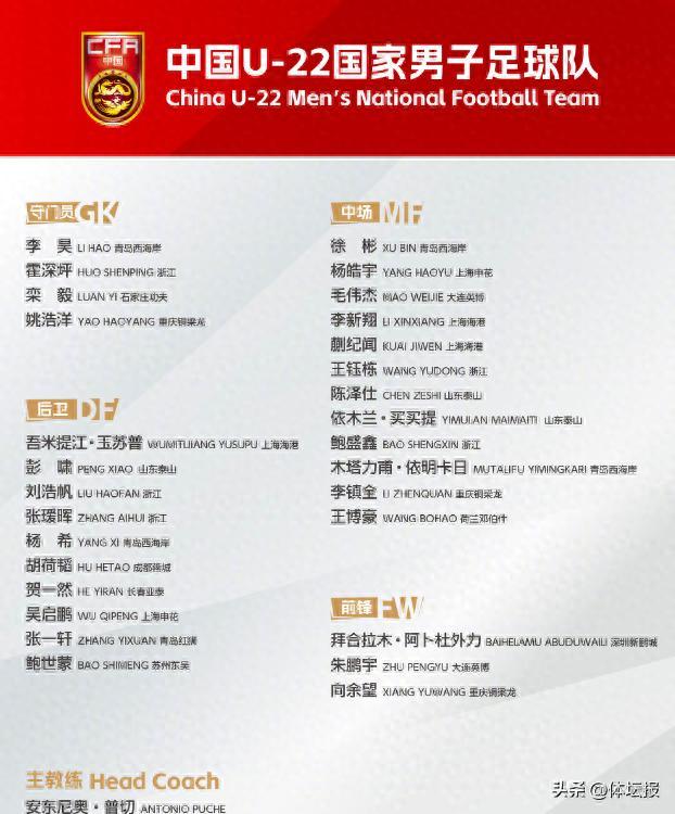王鈺棟領銜,浙江5人入選U23男足亞洲盃名單