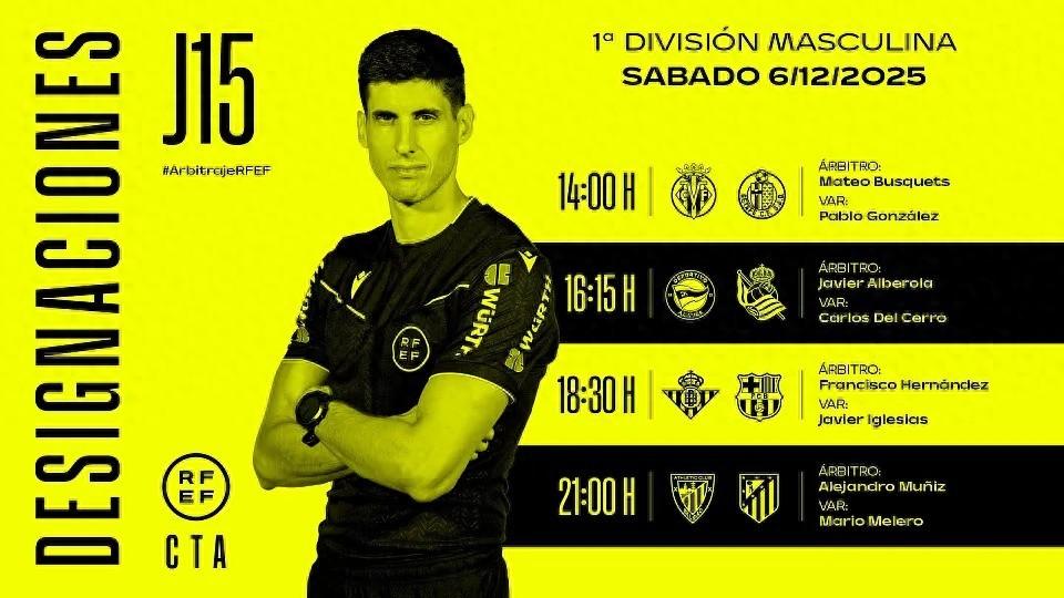 西班牙足協官方公佈了本週六西甲四場比賽的裁判安排,弗朗西斯科-埃爾南德斯將執法巴薩客戰貝蒂斯。