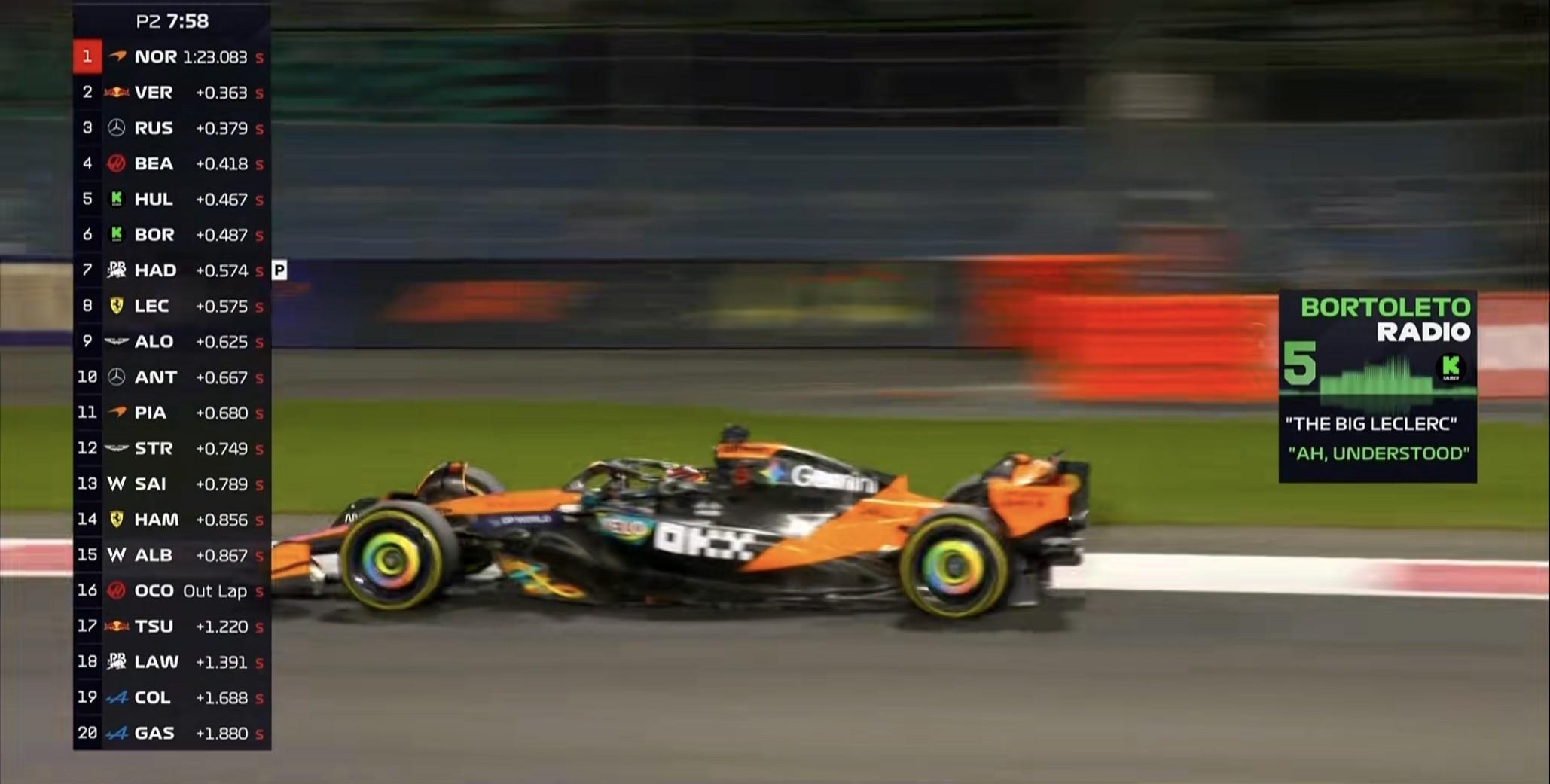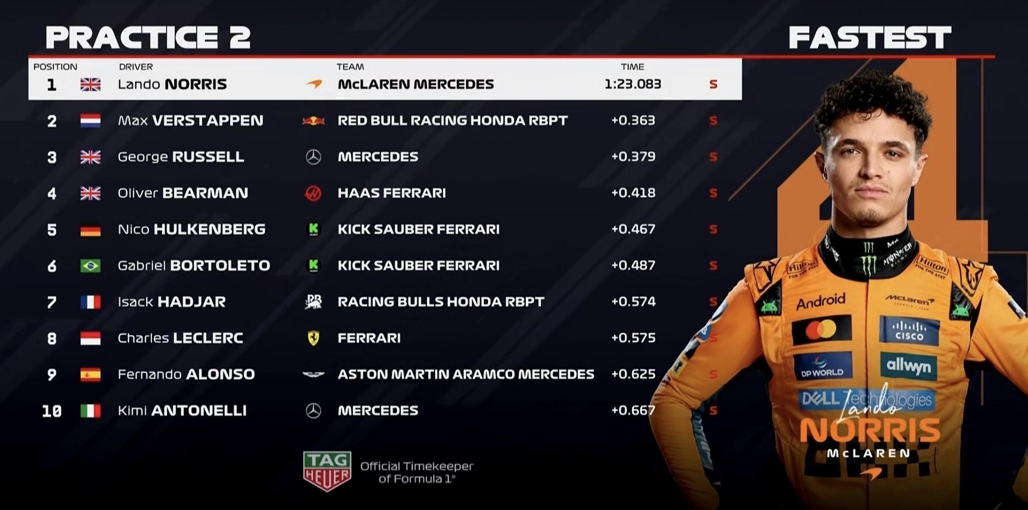 二練時間過半,諾里斯換上軟胎新的一圈來到榜首,領先維斯塔潘0.36秒!