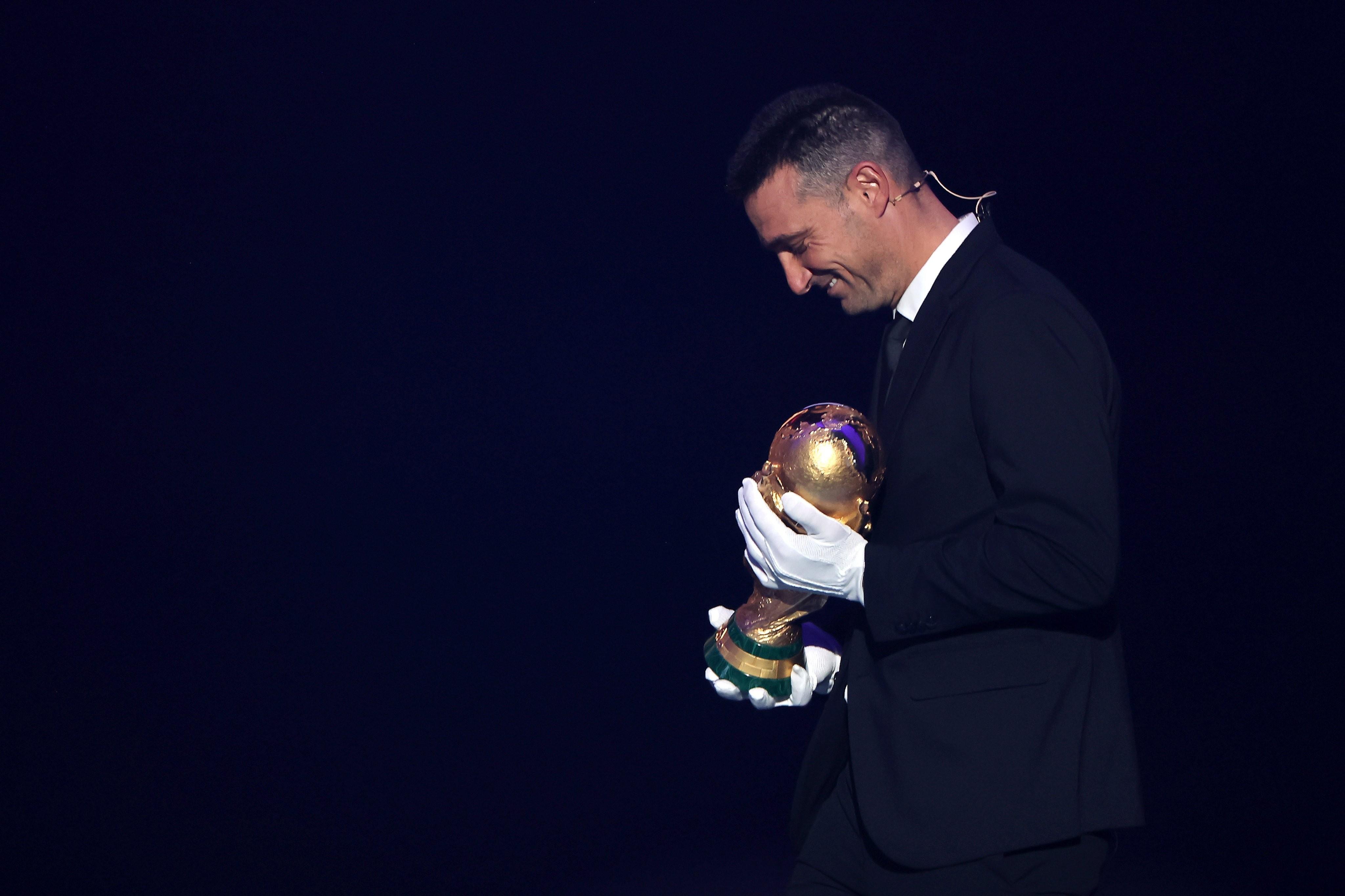 在2022年卡塔爾世界盃上,斯卡洛尼帶領阿根廷隊贏得了世界盃冠軍,在今天的抽籤儀式上,他帶着大力神杯上臺,將獎盃放在了舞臺上。