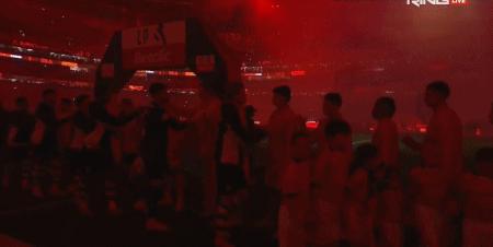 在里斯本光明球場的紅色燈光下雙方球員入場,比賽馬上開始