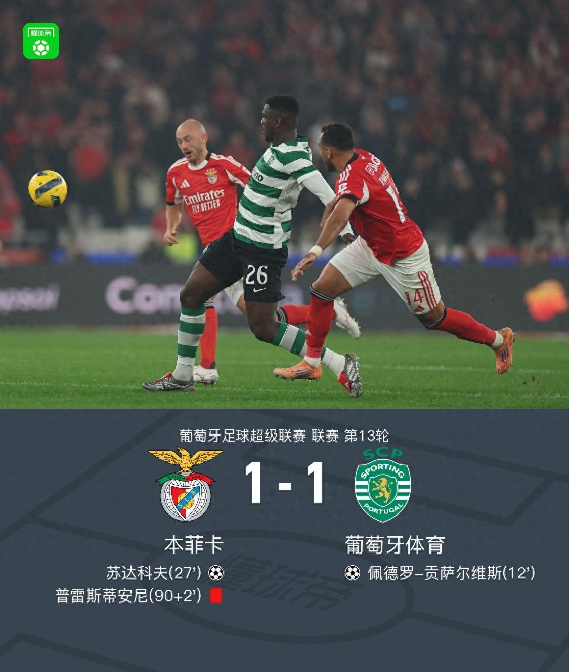 北京時間12月6日,葡萄牙足球超級聯賽第13輪展開較量,本菲卡坐鎮主場迎戰葡萄牙體育。上半場,葡萄牙體育率先打破僵局,佩德羅-貢薩爾維斯接莫滕-尤爾曼德助攻取得進球。隨後本菲卡展開反擊,蘇達科夫在德迪奇的助攻下成功破門,幫助球隊扳平比分。下半場補時階段,本菲卡球員普雷斯蒂安尼被紅牌罰下。最終全場比賽結束,雙方以1比1握手言和。