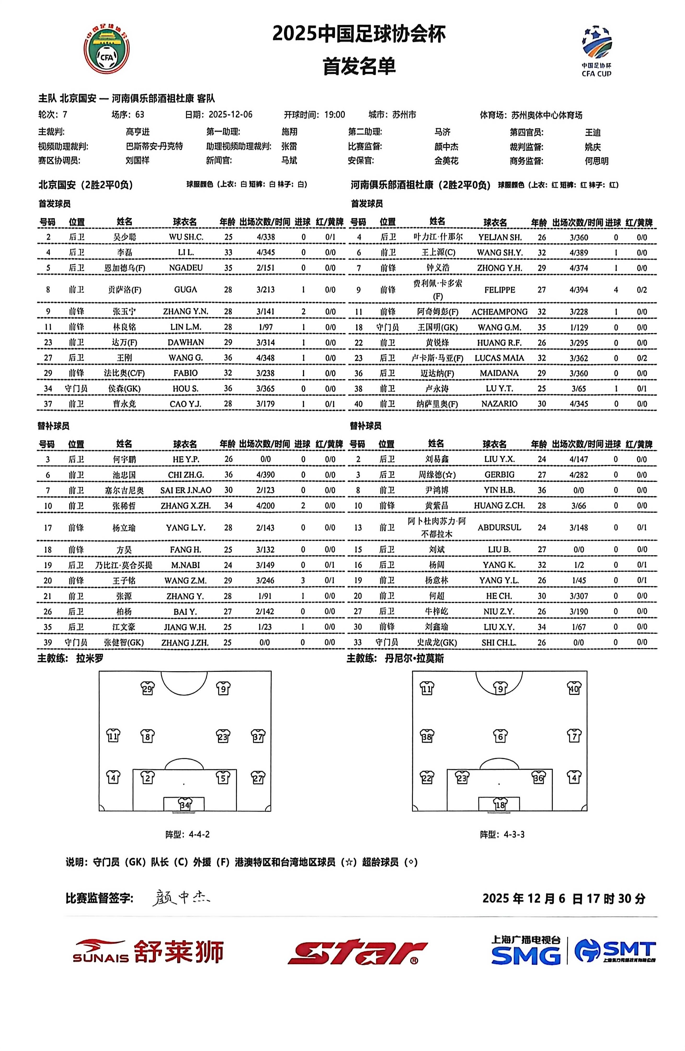 北京時間12月6日19:00,足協盃決賽,北京國安對陣河南隊,本場比賽在蘇州奧體中心舉行,本場比賽主裁判是韓國裁判高亨進,VAR是德國裁判巴斯蒂安-丹克特,賽前雙方公佈首發